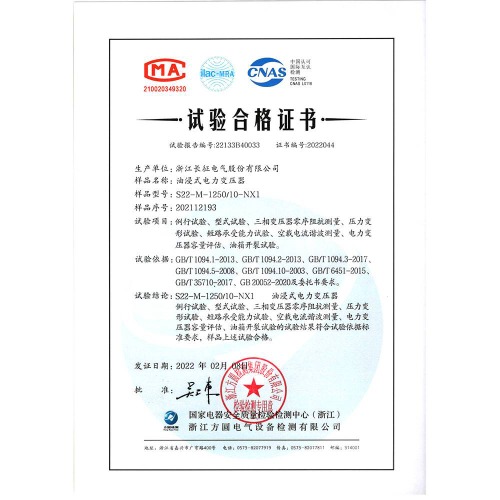S22-M-1250/10-NX1油浸式電力變壓器 試驗合格證書