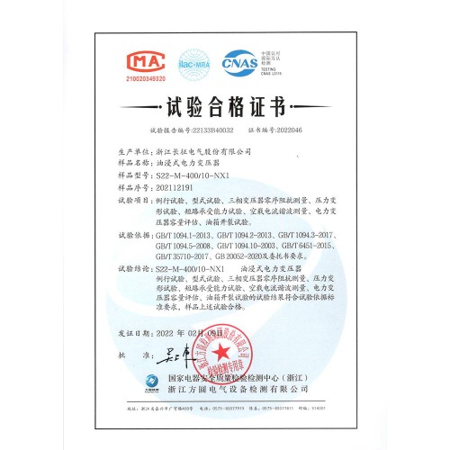 S22-M-400/10-NX1油浸式電力變壓器 試驗合格證書
