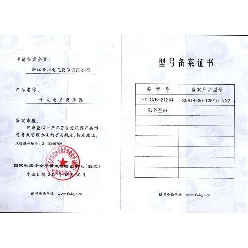 SCB14-30-125/10-NX2干式電力變壓器 型號(hào)備案證書
