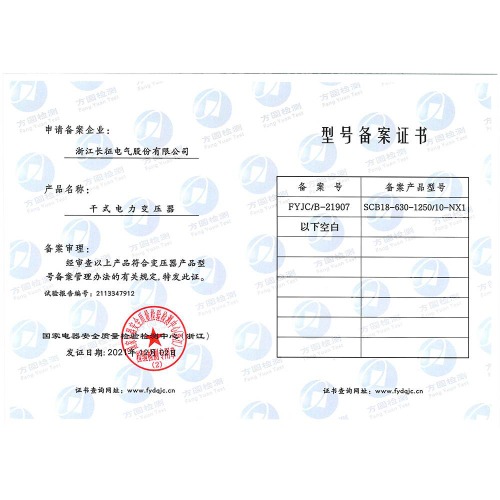 SCB18-630-1250/10-NX1干式電力變壓器 型號(hào)備案證書