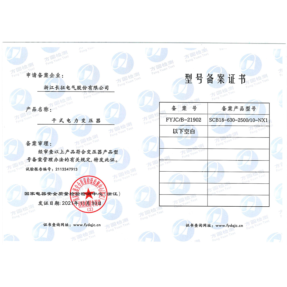 SCB18-630-2500/10-NX1干式電力變壓器 型號(hào)備案證書