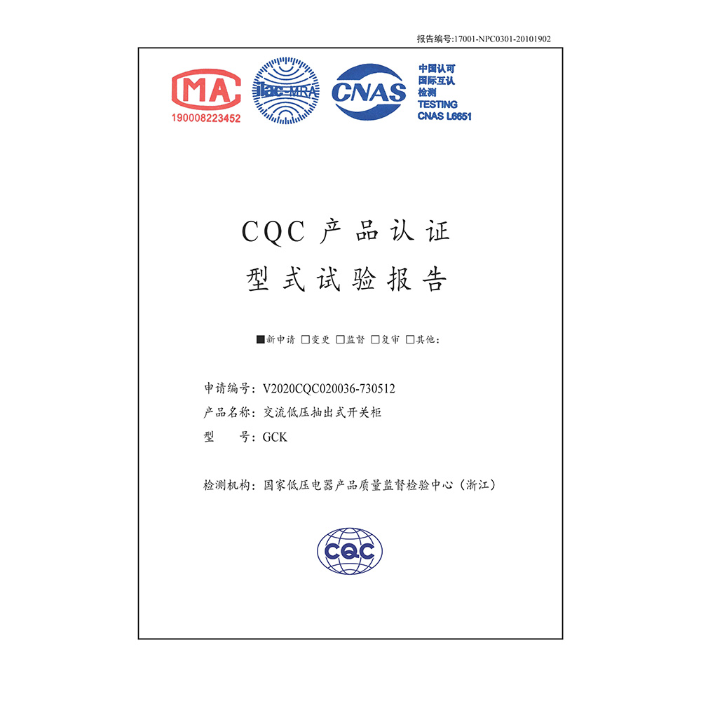 GCK(1600A~4000A)交流低壓抽出式開關柜 CQC型式試驗報告