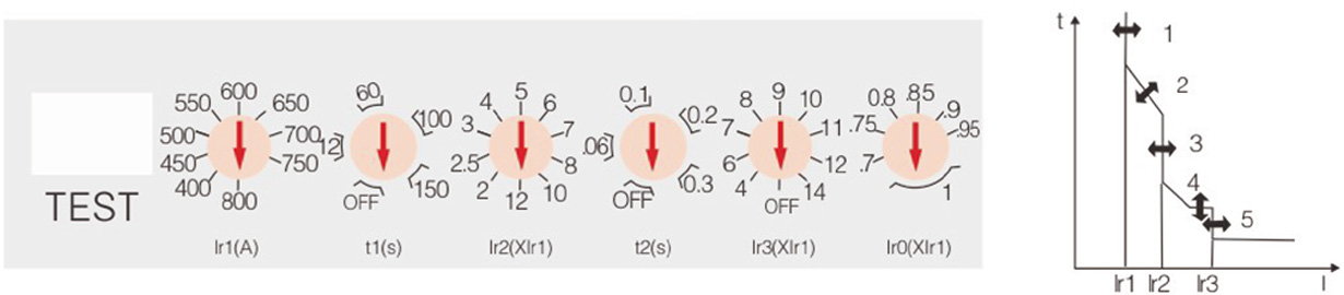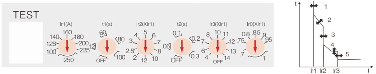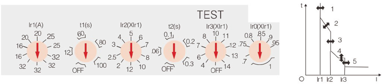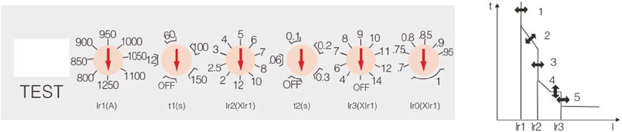 ?1、過載長延時動作電流 Ir1 調整根據斷路器不同的額定電流可從 4 檔到 10 檔進行調整;